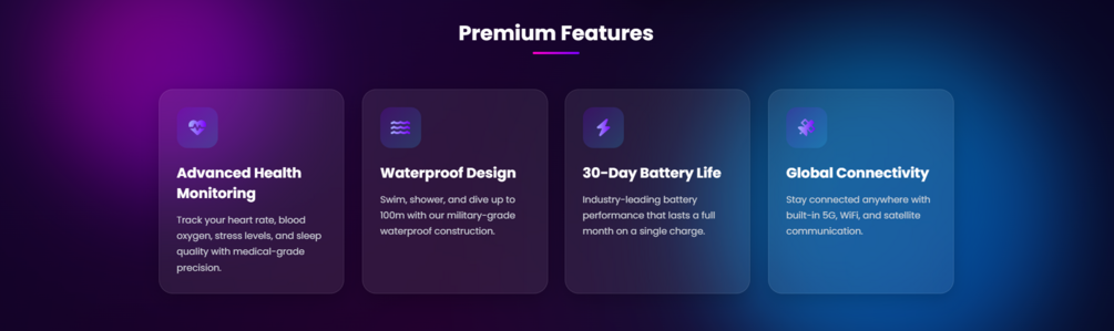 - Feature cards built with glassmorphic styling and minimalistic icons.